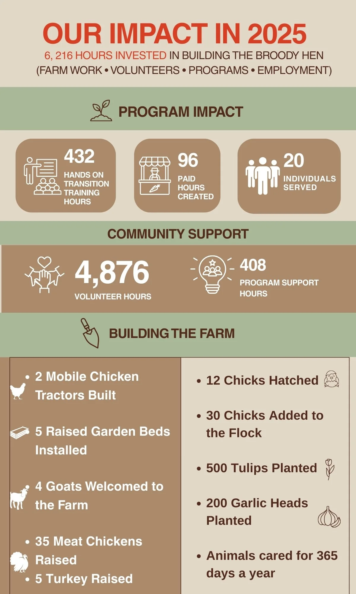 In our first year, a small but dedicated community helped build The Broody Hen into a place where individuals with disabilities can learn, work, and belong. Here is a snapshot of the impact made in 2025.